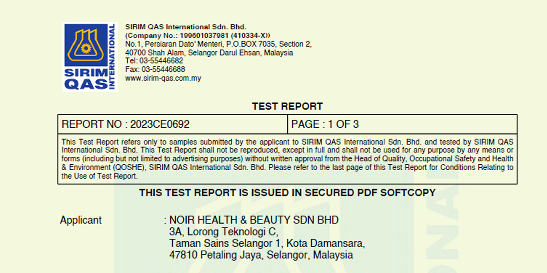 Produk NOIR juga telah diuji dan mendapat kelulusan daripada SIRIM Malayia